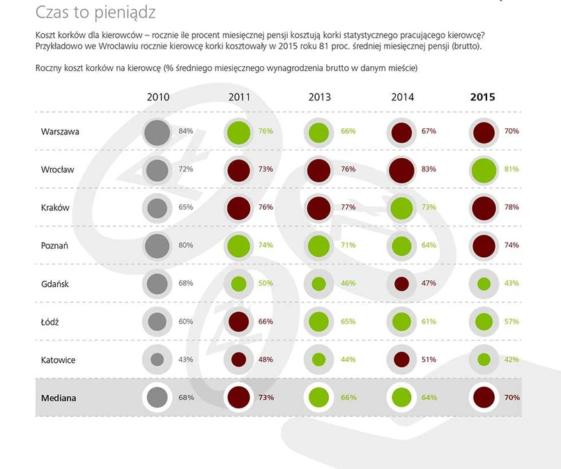 W ujęciu względnym, w relacji do średniego miesięcznego wynagrodzenia w danym mieście, koszty korków najwyższe są we Wrocławiu. Wrocławski kierowca z powodu korków traci rocznie tyle, co prawie cała jedna miesięczna pensja (81% miesięcznego wynagrodzenia).
