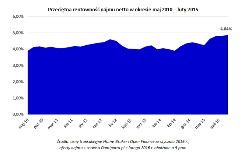 Zakup mieszkania na wynajem nadal zyskuje na popularności wśród polskich inwestorów. Dobra nieruchomość będzie nie tylko przynosić zysk z czynszu, ale i może zyskać na wartości w czasie. Home Broker i Domiporta.pl badają rentowność najmu na wybranych rynkach od wiosny 2010 r. Średnia wartość liczona dla siedmiu miast jeszcze nigdy nie była tak wysoka jak obecnie. Z najnowszych danych wynika, że kupując mieszkanie na wynajem można średnio liczyć na 4,84 proc. zysku netto w skali roku. Rok temu wskaźnik ten wynosił 4,39 proc., co oznacza wzrost zyskowności inwestycji o 10 procent. W ostatnich kwartałach nastąpił spory wzrost opłacalności rentowności najmu, jeszcze na przełomie 2013 i 2014 r. średnio wynosiła ona poniżej 4 proc., obecnie zbliża się do 5 proc. netto.