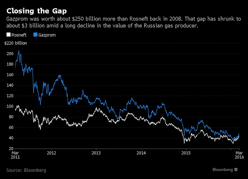 Gazprom, największy na świecie producent gazu naturalnego, jest dziś wart tylko o 3,3 mld dol. więcej niż Rosnieft, rosyjski lider naftowy. Jeszcze w 2008 roku, różnica ta sięgała 280 mld dol. Wiele wskazuje na to, że już niedługo wartość tych dwóch spółek się zrówna, a Rosnieft może wysunąć się na prowadzenie. Wartość rynkowa Gazpromu od pięciu lat systematycznie leci w dół i nie zapowiada się na to, że ten trend się odwróci.
