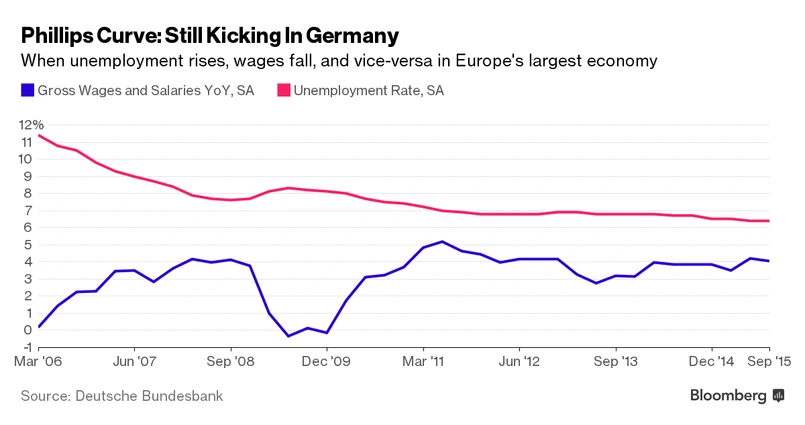 Warto też zauważyć, że choć Niemcy są być może jedynym krajem, w którym utrzymywana jest tradycyjna zależność między bezrobociem i zarobkami, nieco zaskakujący jest fakt, że wzrost płac nie następuje tu szybciej – twierdzi Frederik Ducrozet, ekonomista Banque Pictet & Cie SA z Genewy. Choć bezrobocie znajduje się tu na najniższym poziomie od czasu zjednoczenia Niemiec, trzeci filar zależności Philipsa – wzrost inflacji – jeszcze nie nadszedł.