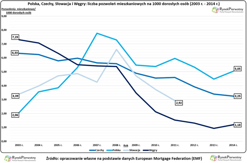 Radykalna obniżka „węgierskiego” podatku VAT od nowych domów i budynków (z 27% do 5%), jest związana z regresem budownictwa – tłumaczy Andrzej Prajsnar z portalu RynekPierwotny.pl. Ten ciekawy proces można prześledzić na podstawie danych Europejskiej Federacji Hipotecznej (European Mortgage Federation - EMF). Poniższy wykres prezentuje również informacje dotyczące trzech innych krajów Europy Środkowej - Polski, Czech i Słowacji. Warto zwrócić uwagę, że na początku minionej dekady Węgry były liderem budownictwa mieszkaniowego. Tamtejsza „mieszkaniówka” w 2003 roku osiągnęła rekordowy wynik (m.in. dzięki hojnym dotacjom z budżetu). Ten rekord wynosił ponad 7 pozwoleń na budowę lokali i domów w przeliczeniu na 1000 dorosłych mieszkańców. W tym samym czasie, na 1000 pełnoletnich Polaków przypadały niewiele ponad dwa pozwolenia na budowę domów i mieszkań (uzyskane przez deweloperów, spółdzielnie, inwestorów indywidualnych, samorządy, TBS-y oraz zakłady pracy).