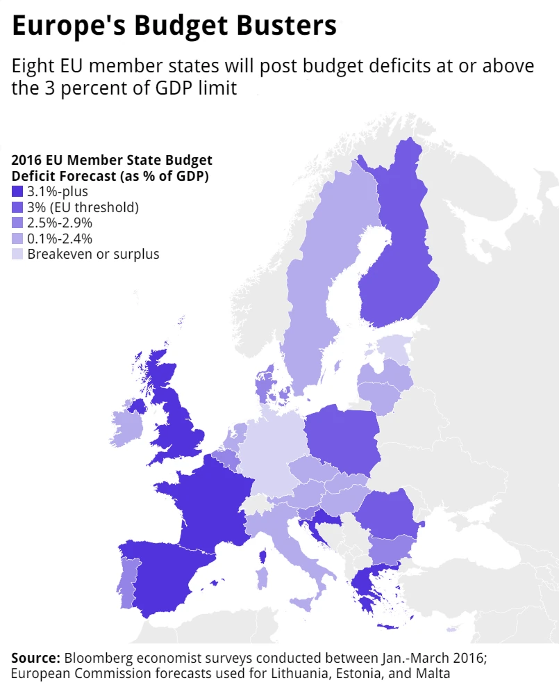 W tym roku klub państw, które przekroczą limity deficytu, będzie liczył najmniej członków od dziewięciu lat. Nawet przygnieciona długiem Grecja i zmagająca się ze stagnacją gospodarczą Francja, będą w stosunkowo niewielkim stopniu naruszać unijne granice fiskalne. W przypadku Grecji, obecny rok będzie już 21. rokiem z nadmiernym deficytem z rzędu. Francja będzie naruszać limit deficytu po raz 9. z rzędu. Komisja Europejska na razie pogroziła tylko palcem obu krajom. Francja otrzymała dodatkowy czas na zrównoważenie budżetu i przeprowadzenie odpowiednich reform. Musi zredukować swój deficyt do 2017 roku. Choć francuski rząd jest przekonany, że uda mu się ograniczyć dziurę budżetową w wyznaczonym terminie, ekonomiści ankietowani przez Bloomberga nie są już tak optymistycznie nastawieni. Prognozują, że w 2017 roku Francja wciąż będzie naruszać unijny limit, a jej deficyt wyniesie 3,2 proc. PKB. Dopiero rok później może spaść do wymaganych 3 proc. PKB.