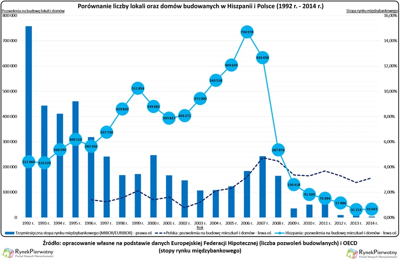 Dane Europejskiej Federacji Hipotecznej (ang. European Mortgage Federation - EMF) o liczbie pozwoleń budowlanych, dobrze pokazują skalę mieszkaniowej gorączki w Hiszpanii (patrz poniższy wykres). Na początku lat 90 - tych, liczba pozwoleń na budowę hiszpańskich domów i mieszkań wynosiła około 200 000 rocznie – tłumaczy Andrzej Prajsnar, ekspert portalu RynekPierwotny.pl. Ten wynik uwzględniający wszystkie kategorie inwestorów (m.in. samorządy i deweloperów), nie mógł jeszcze wzbudzać poważnych obaw. Później roczna liczba pozwoleń budowlanych zaczęła szybko rosnąć (z przerwą w latach 2000 - 2002). Bańka mieszkaniowo - hipoteczna najszybciej pęczniała od 2003 r. do 2006 r. (patrz poniższy wykres). W rekordowym 2006 roku, liczba pozwoleń mieszkaniowych zbliżyła się od 735 000. Analogiczny wynik dla Polski wówczas wynosił około 161 000 pozwoleń na budowę (patrz poniższy wykres). Rok później, polski boom mieszkaniowy osiągnął swój szczytowy punkt, a liczba pozwoleń przekroczyła 235 000. Na 1000 dorosłych Polaków wówczas przypadało prawie 8 nowych pozwoleń budowlanych. Podobny wynik z Hiszpanii, w 2007 r. przekraczał 17 pozwoleń na 1000 pełnoletnich mieszkańców. Te dane statystyczne udowadniają, że hiszpańską budowlaną gorączkę trudno porównać z krajowymi realiami.