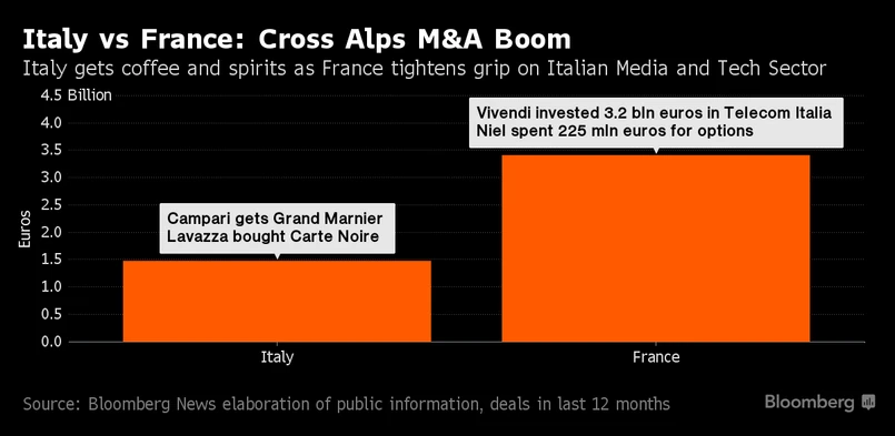 W tym samym okresie Francja zwiększyła swoje wpływy we włoskim rynku energetycznym poprzez zakup przez Electricite de France firmy Edison SpA. Znany francuski producent nabiału Lactalis nabył pakiet kontrolny włoskiego spożywczego giganta – Parmalatu. Po raz pierwszy w historii inwestor znad Sekwany wszedł w posiadanie udziałów w największym włoskim banku inwestycyjnym Mediobanca SpA. Należący do dyrektora Vivendi Vincenta Ballore’a Financiere Du Perguet stał się drugim największym inwestorem we włoskim banku, a jego córka Marie została członkinią zarządu.