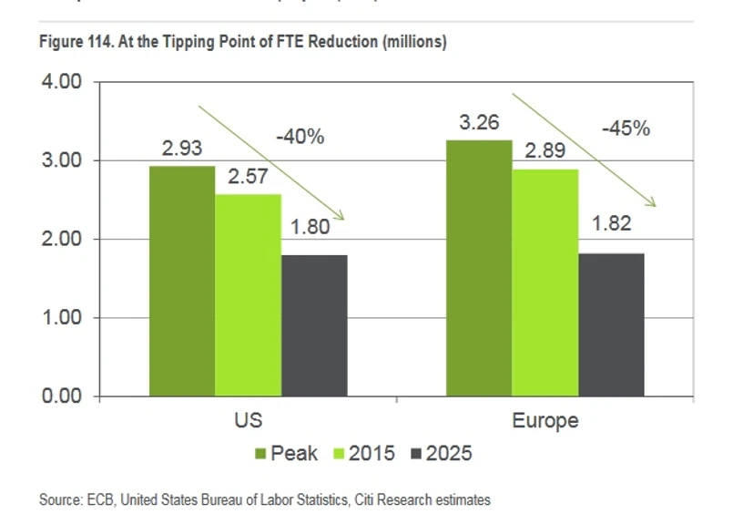 Autorzy raportu szacują, że z powodu rosnącego wpływu technologii na sektor finansowy, do 2025 roku banki mogą zwolnić nawet 30 proc. swoich pracowników. W porównaniu z 2007 rokiem, zatrudnienie w sektorze bankowym w USA ma spaść do tego czasu o 40 proc., a w Europie – o 45 proc.