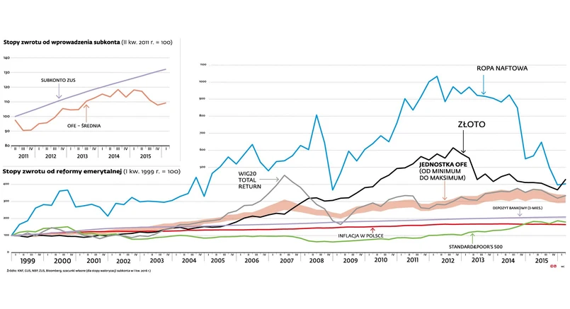 Pod względem stopy zwrotu OFE w całej swojej historii przynoszą wyniki lepsze niż wyniosłaby przeliczona na złote inwestycja w najważniejszy indeks giełdy w Nowym Jorku S&P500 (w 1999 r. nie było u nas jeszcze powszechnie dostępnych instrumentów pozwalających na taką inwestycję), ale równocześnie wypadają słabiej niż lokata w złoto, a nawet w ropę naftową.