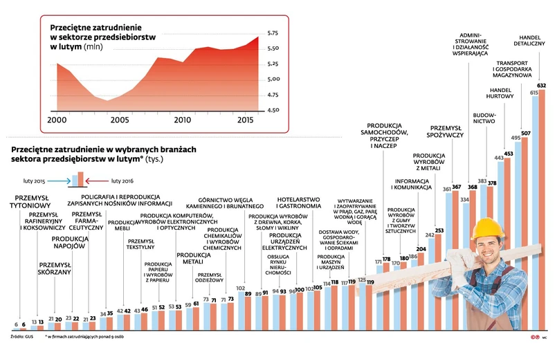 Przedsiębiorstwa zatrudniające ponad 9 osób tworzą coraz więcej etatów. W rezultacie tylko w lutym zatrudnienie w firmach wzrosło o 8 tysięcy, a w porównaniu z analogicznym miesiącem roku poprzedniego podskoczyło o 138 tysięcy, do ponad 5,7 mln – wynika z danych GUS. Tak wysokiego poziomu zatrudnienia w przedsiębiorstwach nie było od co najmniej 2000 r., od kiedy dostępne są tego typu dane.