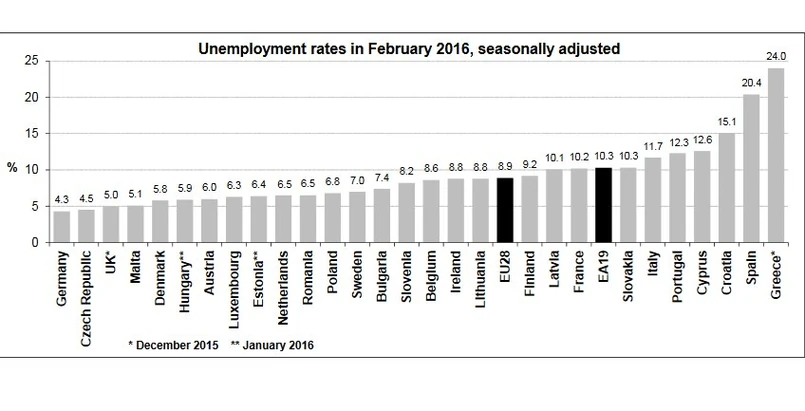 Najniższe bezrobocie w Unii notuje się dziś w Niemczech (4,3 proc.) i Czechach (4,5 proc.). Najwyższy wskaźnik niezmiennie doskwiera Grecji (24 proc. - ostatnie dostępne dane za grudzień 2015) i Hiszpanii (20,4 proc.). W porównaniu z poprzednim rokiem, w lutym 2016 roku bezrobocie najmocniej spadło na Cyprze (z 16,6 proc. do 12,6 proc.), Hiszpanii ( z 23,2 proc. do 20,4 proc.) i w Bułgarii (z 9,8 proc. do 7,4 proc.). Wzrost wskaźnika zanotowano w Austrii ( z 5,4 proc. do 6 proc.), na Łotwie (z 9,7 proc. do 10,1 proc.) oraz w Finlandii (z 9,1 proc. do 9,2 proc.).
