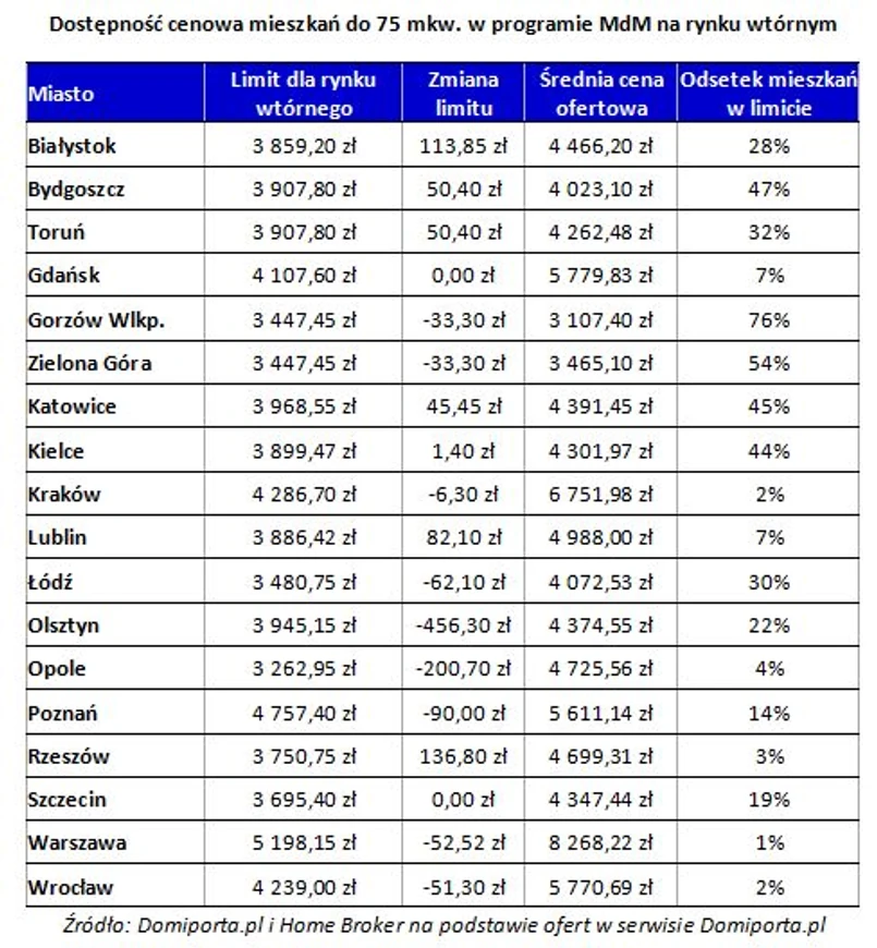 Mimo obniżki limitu od początku kwietnia, największą dostępność nowych mieszkań w programie MdM znajdziemy w Olsztynie – wg analizy Domiporta.pl i Home Brokera, warunek cenowy spełnia tam 61 proc. mieszkań o powierzchni do 75 mkw. Narzekać nie mogą też kupujący w Gdańsku (47 proc.), Toruniu (46 proc.), Białymstoku (37 proc.) oraz Bydgoszczy i Poznaniu (po 31 proc.). Najtrudniej o nowe mieszkanie spełniające warunki ustawy jest w Łodzi (5 proc.) i Warszawie (9 proc.). Łódź jest tu ciekawostką, bo to jedno z czterech miast, w których dostępność MdM na rynku pierwotnym jest niższa od rynku wtórnego. Podobnie jest w Bydgoszczy, Katowicach i Kielcach.