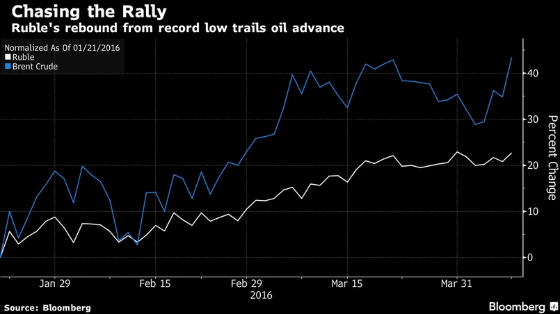 Wspomniane powyżej fundusze dołączyły do rzeszy analityków różnych instytucji, począwszy od Goldman Sachs Group a skończywszy na JPMorgan Chase & Co., którzy podnieśli w marcu swoje prognozy wartości rosyjskiej waluty. Szacunki te opierają się na założeniu że rynek ropy, od którego zależna jest rosyjska gospodarka, ustabilizuje się w najbliższym czasie po zeszłorocznych spadkach na poziomie 60 proc. Chociaż rubel umocnił się w porównaniu do styczniowego minimum w największym stopniu spośród wszystkich walut gospodarek wschodzących, było to jednak o wiele skromniejsze odbicie niż w przypadku ropy Brent, wobec czego eksperci dostrzegają ciągle miejsce na dalsze wzrosty.