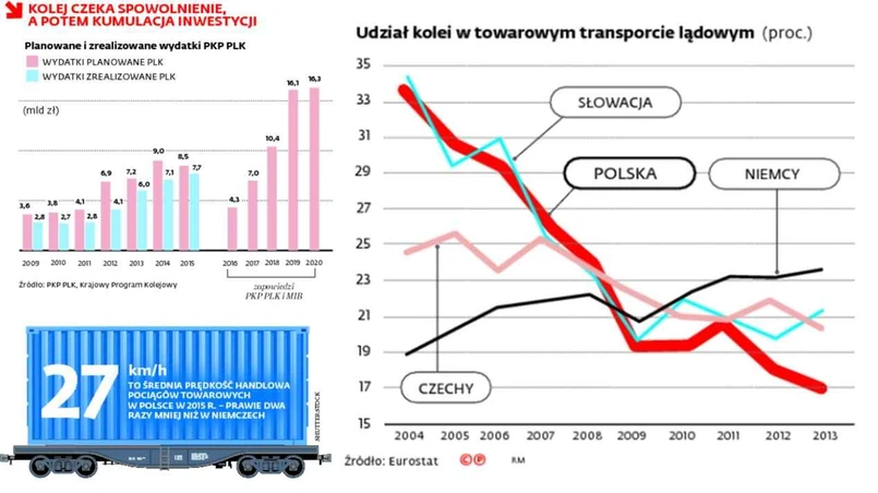 Ocena polskiej kolei od strony infrastrukturalnej w oczach ekspertów unijnych jest jednoznacznie negatywna. Urzędnicy twierdzą, że transport kolejowy w Polsce nie jest w stanie skutecznie konkurować z drogowym, którego infrastruktura bardzo poprawiła się jakościowo i ilościowo w latach 2004–2015. Na kolei progres jest, ale znacznie wolniejszy. Wytykają, że wykorzystanie sieci kolejowej jest w naszym kraju niemal dwukrotnie niższe niż w Czechach i na Słowacji, i prawie pięć razy gorsze niż w Niemczech. Tylko połowa z 19 tys. km linii PKP jest w dobrym stanie technicznym. A średnia prędkość handlowa pociągów towarowych w naszym kraju w 2015 r. to tylko 27 km/h (prawie dwa razy mniej niż w Niemczech).
