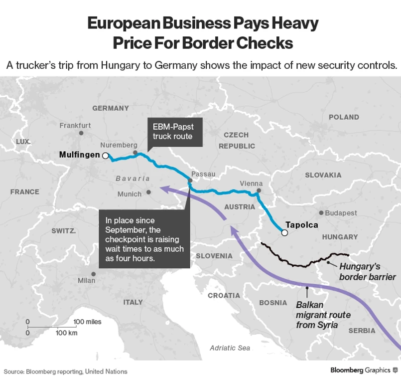 Dla firm transportowych, które zatrudniają kierowców takich jak Zoltan Unczorg, wprowadzenie kontroli granicznych znacząco podnosi koszty działalności poprzez straty wynikające z opóźnień czy magazynowania towarów. Zdaniem szefa firmy EBM-Papst produkującej silniki i wentylatory, stałe kontrole graniczne całkowicie zniszczą model biznesowy niemieckiego przemysłu. „Części, których potrzebujemy do montażu produktu tutaj w Niemczech, otrzymujemy dokładnie na czas. To dlatego ciężarówki kursują non-stop. Przyjeżdżają tu, rozładowują towar, ładują z powrotem i odjeżdżają. Koszty związane z przywróceniem kontroli nie są więc jedynym problemem. Po prostu nie będziemy mogli funkcjonować” – mówi Rainer Hundsdoerfer.