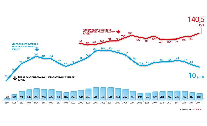 W marcu w urzędach pracy zarejestrowanych było 1,6 mln bezrobotnych – podał GUS. Stopa bezrobocia spadła do 10 proc. i była o 1,5 pkt proc. niższa niż przed rokiem. Tak dobrych wyników z rynku pracy nie było od 1992 r., porównując wskaźniki z marca poprzednich lat.