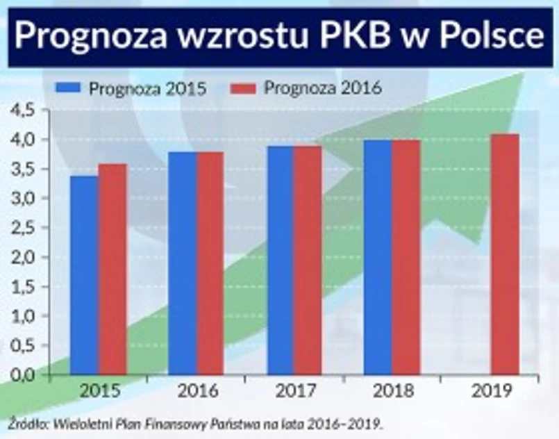 MF zakłada, że czynnik ten nie wpłynie jednak na wzrost PKB w Polsce, tym bardziej, że przyspieszyć mają inwestycje publiczne. Od 2017 r., w związku z oczekiwanym przyspieszeniem wydatkowania środków unijnych, udział inwestycji sektora rządowego i samorządowego w PKB będzie się zwiększał, z 4,3 proc. w roku 2016 do 4,6 proc. w 2017 r. i 4,7 proc. w latach 2018-19. W efekcie dynamika inwestycji wyniesie: w 2016 roku 4,7 proc., a w kolejnych 6,7 proc., 7,3 proc. i 7,6 proc. Udział inwestycji prywatnych w PKB na koniec 2019 r. zwiększy się do 18,1 proc. PKB, a inwestycji wszystkich do 22,8 proc.