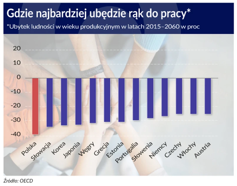 OECD szacuje, że Polskę czeka spadek populacji w wieku produkcyjnym o niebagatelne 40 proc. Zmniejszającej się szybko liczbie osób w wieku produkcyjnym towarzyszyć będzie jednocześnie zwiększanie się liczby emerytów. Dziś współczynnik zależności ekonomicznej w wieku starszym w Polsce to około 33. W 2050 r. ten współczynnik zależności ma podskoczyć powyżej 87.