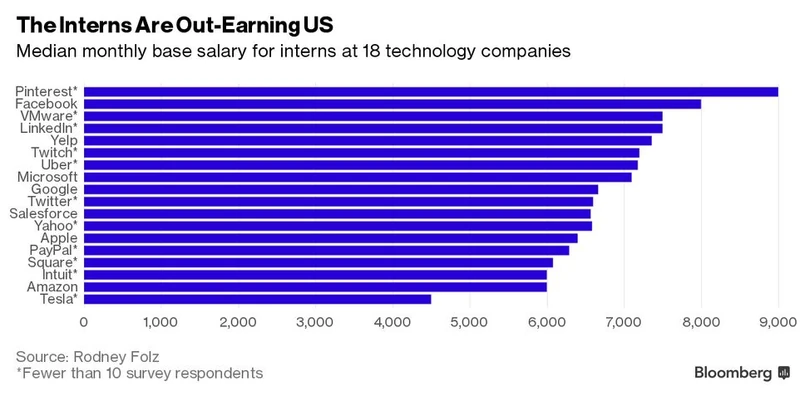 Ostateczny wynik, czyli mediana 6800 dol. miesięcznie – został obliczony na podstawie odpowiedzi stażystów z 18 firm, których wskazania najczęściej się powtarzały. W sumie wzięto pod uwagę 298 odpowiedzi. Biorąc pod uwagę tylko te ankiety, można stwierdzić, że miesięczna pensja stażysty wahała się od 9 tys. dol. w Pinterest do 4,5 tys. dol. w Tesla Motors w Palo Alto.