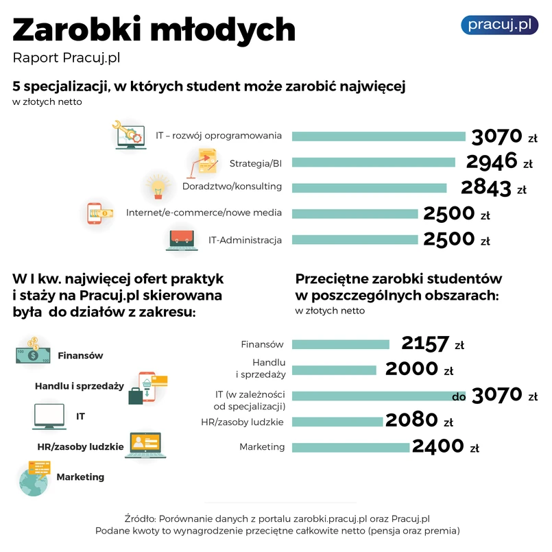 Studenci kierunków związanych z finansami także nie powinni mieć problemu ze znalezieniem ofert praktyk i staży; w I kwartale przyszłych finansistów pracodawcy poszukiwali najczęściej publikując aż 675 ogłoszeń skierowanych do nich, co stanowiło wzrost o 15% w stosunku do I kw. 2015 r. Szczególnie dobrze wynagradzani są pracownicy w obszarze doradztwo/konsulting – studenci mogą w tym obszarze zarobić przeciętnie 2843 zł netto. Dobre informacje płyną także z danych Pracuj.pl dla studentów marzących o karierze w obszarze strategia/business intelligence, również bardzo dobrze opłacany obszar, w którym mediana zarobków wśród studentów sięga 2946 zł netto.