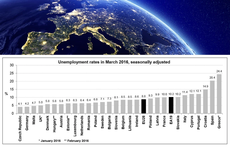 Stopa bezrobocia w strefie euro wyniosła 10,2% w marcu 2016 r. wobec 10,4% miesiąc wcześniej, podał unijny urząd statystyczny Eurostat. Rok temu wskaźnik ten wynosił 11,2%.