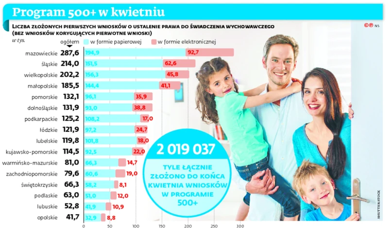 W pierwszym miesiącu działania programu wnioski złożyło ponad 2 mln rodzin. – To naprawdę imponujący rezultat. To już ok. 75 proc. wniosków, na które liczymy – mówiła minister rodziny, pracy i polityki socjalnej Elżbieta Rafalska w RMF FM. Do zeszłego tygodnia urzędnicy wydali 400 tys. decyzji i wypłacono 127 mln zł.