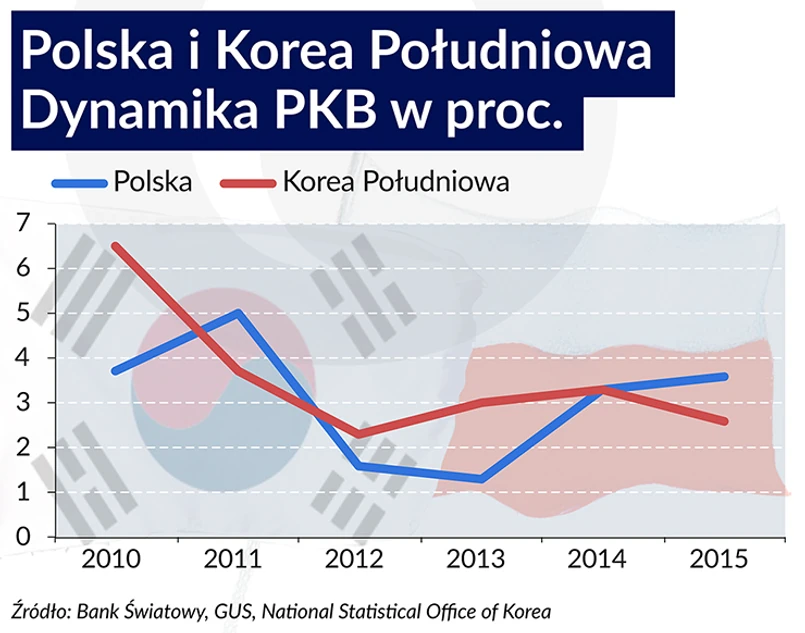 W latach 2001–2015 PKB Polski wzrósł o 70 proc., a Korei Południowej o 78 proc. W 2015 roku gospodarka koreańska urosła o 2,6 proc., a Polska o 3,6 proc.