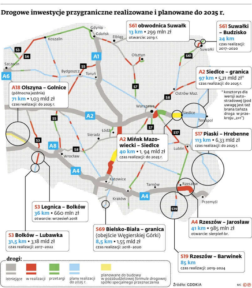 U nas jest przetarg na odcinek Lublin – Rzeszów. Dodatkowo GDDKiA deklaruje, że do 2024 r. zbuduje fragment z Rzeszowa do granicy ze Słowacją w Barwinku (mimo że posiada dla niego na razie tylko strategiczną ocenę oddziaływania na środowisko – STEŚ). Nieznany jest np. szczegółowy przebieg na północ od Białegostoku: rząd chciałby, że odgiąć trasę na Litwę, ale nie wiadomo, jak ominąć obszary Natura 2000.