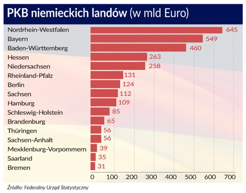 W chwili zjednoczenia Niemiec Nadrenia Północna-Westfalia była bezapelacyjnie najsilniejszym krajem związkowym. Wytwarzano tam prawie ¼ niemieckiego PKB. W tamtejszym Zagłębiu Ruhry rozwinęło się m.in. niemieckie górnictwo, hutnictwo i przemysł chemiczny. Takie miasta jak Leverkusen, Kolonia czy Dortmund słyną nie tylko z klubów piłkarskich, ale i z wywodzących się z tego regionu wielkich koncernów jak Bayer, Henkel, Evonik i Metro. W ostatnim ćwierćwieczu ten land należał jednak do tych, które rozwijały się najwolniej. Dziś jego udział w tworzeniu niemieckiego PKB spadł do 20 proc. Jeśli trend się nie zmieni, to za dekadę straci na rzecz Bawarii tytuł najsilniejszego gospodarczo regionu Niemiec.
