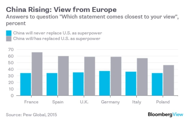 Z ankiety Pew Global Research z 2015 roku wynika, że większość badanych w większości europejskich krajów spodziewa się, że Chiny zastąpią USA na pozycji supermocarstwa lub nawet, że to już się dokonało.