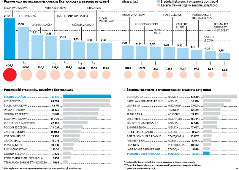 Słaba frekwencja to w praktyce stracone miliony złotych. Jeśli przyjmiemy, że średnia cena biletu na spotkanie Legii wynosi ok. 40 zł, warszawski zespół w samym tylko sezonie 2015/16 mógł zarobić o ponad 7 mln zł więcej. Znacznie większa kwota przeszła koło nosa właścicielom Śląska Wrocław. W ich przypadku słaba frekwencja pomniejsza potencjalny budżet o 20 mln zł. W sumie, według naszych szacunków, klubowe budżety mogły urosnąć o grubo ponad 100 mln zł, co w przypadku polskiej piłki klubowej jest zawrotną kwotą. To, co jednak udało się klubom zarobić, w znacznej mierze było zasługą Legii, która przyciągała na stadiony zdecydowanie najwięcej kibiców. W dziewięciu przypadkach przyjazd „Wojskowych” przyniósł frekwencyjny rekord. Jednostkowo najwięcej kibiców pojawiło się także na meczu Legii. Podczas konfrontacji „Wojskowych” z Lechem w Poznaniu na trybunach zasiadło 41,5 tys. osób. Dla porównaniu drugie co do wielkości widowisko, mecz Legii z Piastem w Warszawie, przyciągnęło ponad 12 tys. kibiców mniej.