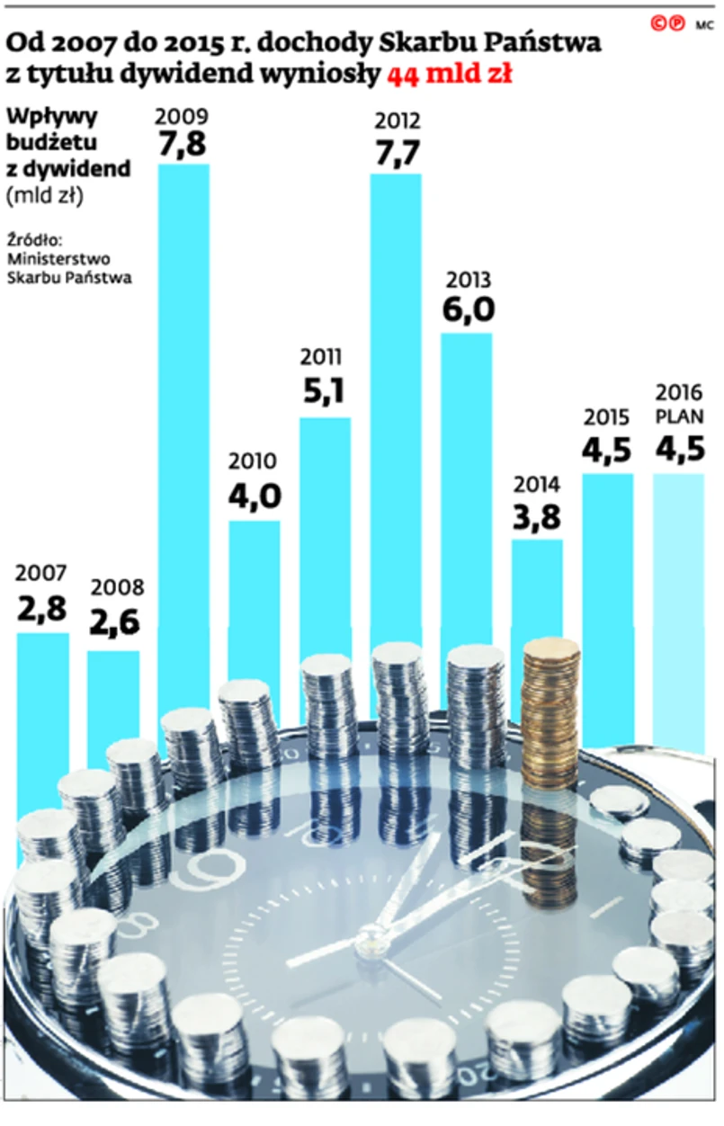 W czerwcu walne zgromadzenia spółek nadzorowanych przez resort skarbu będą decydować o kwotach, jakie firmy wypłacą z tytułu dywidend z zysku za 2015 r. Co do zasady, uzyskanie zakładanych dochodów uzależnione jest przede wszystkim od wyników finansowych spółek, realizowanych inwestycji, sytuacji rynkowej oraz w przypadku instytucji finansowych – rekomendacji i indywidualnych zaleceń KNF.