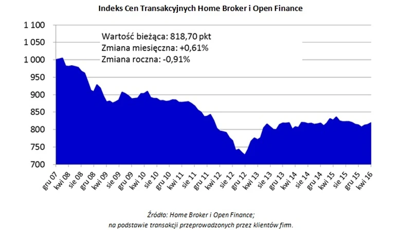 818,7 punktów, o 0,61 proc. więcej niż przed miesiącem, wyniósł majowy odczyt Indeksu Cen Transakcyjnych, który Home Broker wylicza na podstawie median cen z transakcji mieszkaniowych dokonanych przez klientów Home Brokera i Open Finance. Już prawie trzy lata trwa stabilizacja tego wskaźnika, który przez ten czas praktycznie nie opuszcza przedziału 800-820 punktów. Cały czas jest tak, że ceny wahają się głównie w mniejszych ośrodkach, gdzie ze względu na mniejszą próbkę statystyczną łatwiej o zmiany średnich. W Warszawie czy Wrocławiu wahania cen są niewielkie.
