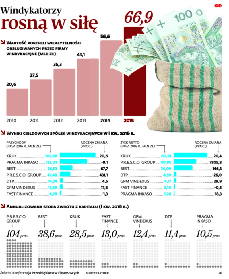 Choć długotrwały i żmudny proces odzyskiwania wierzytelności jest dla działających w branży firm bardzo zyskowny. W 2015 r. wynik netto Kruka, lidera rynku, który kupuje kilkanaście procent oferowanych na rynku wierzytelności, wyniósł 204 mln zł, przy przychodach operacyjnych na poziomie 611 mln zł. Best osiągnął 141 mln zł przychodów i zysk netto w wysokości 82 mln zł. W I kw. tego roku rentowność kapitałów obu firm wynosiła 30–40 proc. Mniejsze firmy są zwykle również mniej dochodowe, ale w żadnej zwrot z kapitału na początku roku nie wynosił mniej niż 10 proc. Dla porównania w giełdowych bankach było to średnio 6,6 proc.