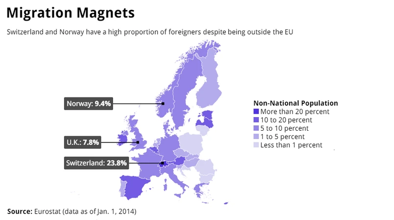 Zwolennicy Brexitu, którzy chcą ograniczenia imigracji na Wyspy, na pewno nie będą odwoływali się do przykładu Szwajcarii albo Norwegii. Oba te kraje są podawane w Wielkiej Brytanii jako modelowe pod względem ścisłej współpracy z blokiem unijnych państw. Oba mają też jednak znacznie wyższy odsetek obcokrajowców niż Wielka Brytania.