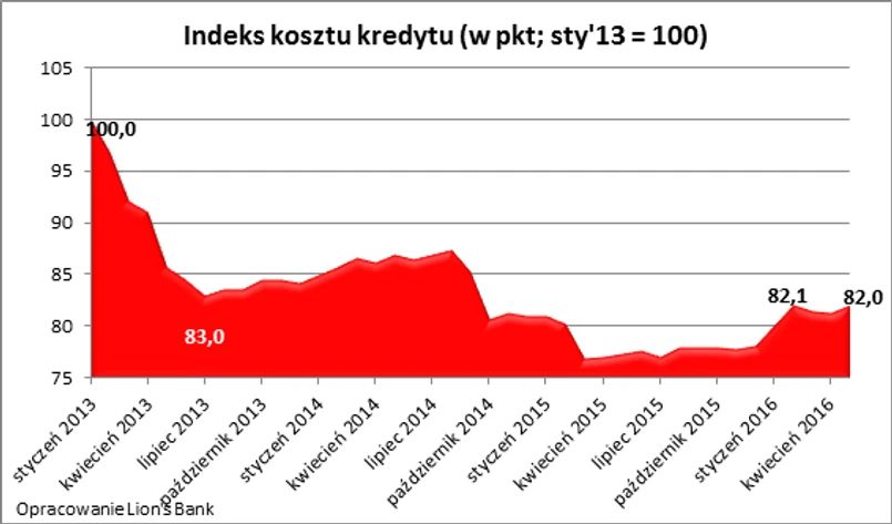 Wartość indeksu kosztu kredytu (IKK) w maju br. osiągnęła poziom 82 pkt. Aktualna odczyt sugeruje, że chcąc kupić mieszkanie na kredyt w jednym z 10 największych polskich miast, trzeba się liczyć z kosztem wyraźnie wyższym niż przed rokiem (o 6,1%).