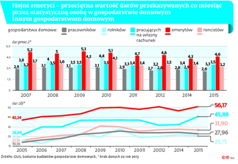 Prawdopodobnie większość tych pieniędzy trafiła do najbliższych – dzieci, wnuków i innych krewnych. Dary przekazane przez gospodarstwa domowe emerytów są jeszcze większe, ponieważ w części z nich są osoby, które nie pobierają emerytur, a też są uwzględniane w statystyce darczyńców.