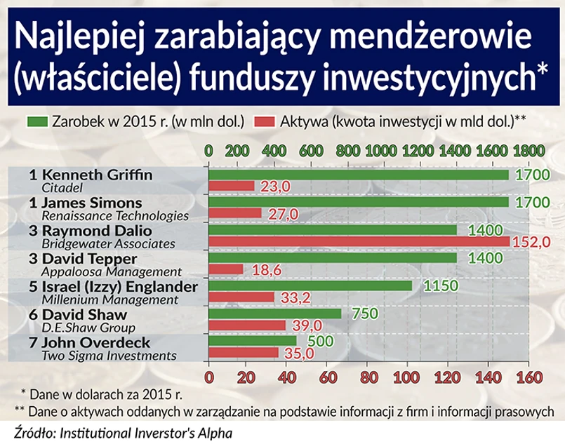 Według „Institutional Investor’s Alpha”, menedżerom funduszy inwestycyjnych wiedzie się jednak ostatnio kiepsko. Tak kiepsko, że dwaj najskuteczniejsi na świecie -Kevin Griffin z Citadel i James Simmons z Renaissance Technologies – zarobili w 2015 r. zaledwie po 1,7 mld dolarów każdy. Ostatni specjalista uwzględniony na liście Top 25 zarobił w 2015 r. 135 mln dolarów, czyli też zupełnie nieźle, a jednak mało. 25 osób z najwyższymi zarobkami uciułało łącznie w 2015 r. niecałe 13 mld dolarów, o 11 proc. więcej niż w 2014 r., ale niemal o polowę mniej niż w rekordowym 2009 r.