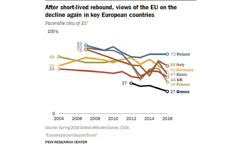 Pomimo szerzącego się eurosceptycyzmu, 70 proc. mieszkańców państw UE, z wyłączeniem Wielkiej Brytanii, jest zdania, że ewentualny Brexit zaszkodzi całej wspólnocie. Tylko 16 proc. popiera wyjście Londynu z UE. Badania Pew były przeprowadzane od kwietnia do maja 2016 r. i skupiały się na mieszkańcach państw, które razem odpowiadają za 80 proc. populacji UE i 82 proc. unijnego PKB.