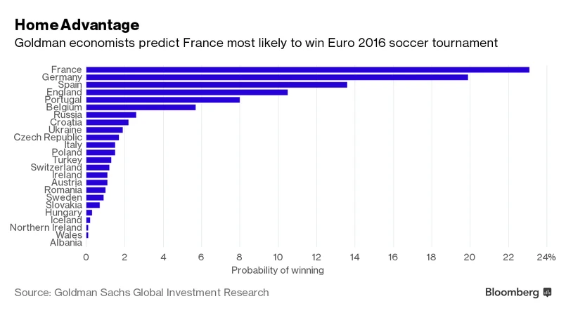 Analitycy Goldmana opracowali model, za pomoc którego można oszacować prawdopodobieństwo wygranej drużyn piłkarskich w Euro 2016. W tym celu przeanalizowali wyniki 4 719 międzynarodowych meczów rozgrywanych od 1958 roku oraz wyniki rankingu ELO, który określa moc reprezentacji narodowych w piłce nożnej. Z szacunków ekonomistów wynika, że największe szanse na zwycięstwo turnieju ma jego gospodarz. Ostatni raz Francja zajęła pierwsze miejsce podczas mistrzostw Europy w 2000 roku.