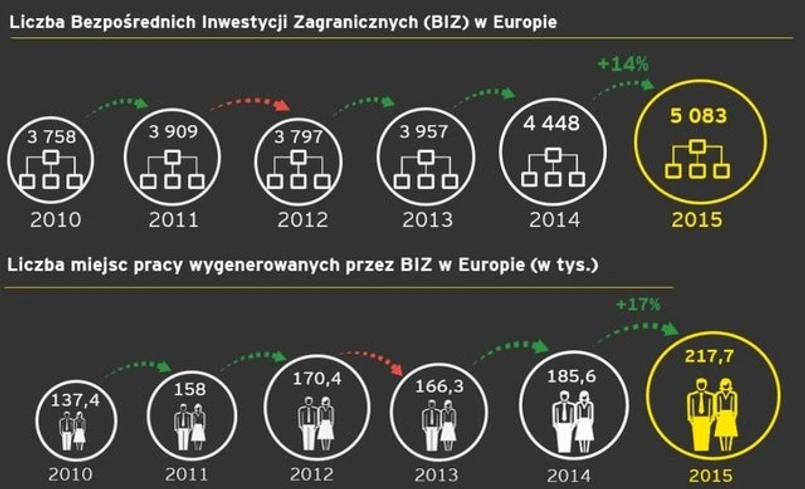 Z raportu wynika, że w Europie powstało ponad 5 tys. projektów liczby Bezpośrednich Inwestycji Zagranicznych (BIZ), które wygenerowały 217 tys. 666 nowych miejsc pracy. Polska może się pochwalić 211 projektami BIZ, w których zatrudnienie znalazło 19 tys. 651 osób.