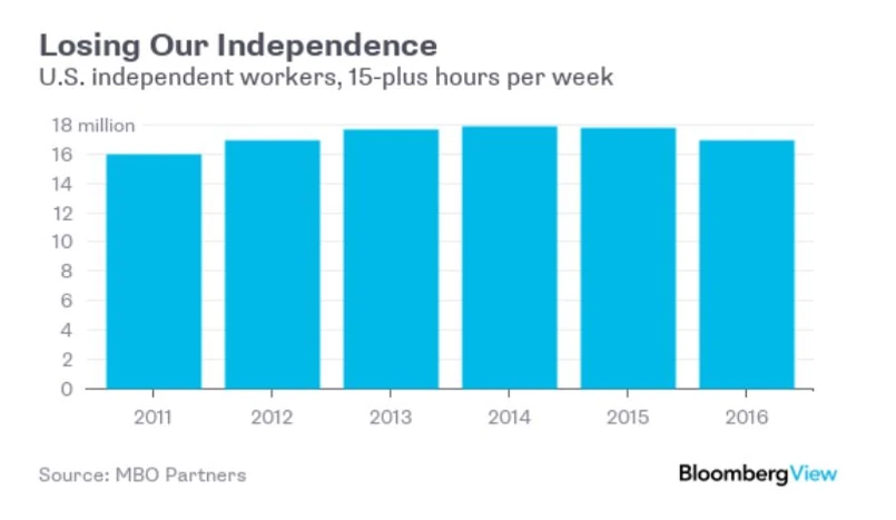 Dane te pochodzą od firmy MBO Partners, która zajmuje się dostarczaniem usług niezależnym, samodzielnym pracownikom. Na potrzeby tej ankiety zdefiniowano ich jako „tych, którzy świadczą usługi konsultacyjne, są freelancerami, pracują kontraktowo, w ramach umów czasowych czy są na telefoniczne wezwanie usługobiorcy każdego tygodnia”. Definicja ta jest bardzo podobna do tej zastosowanej przez Lawrence Katza i Alana Krugera w odniesieniu do pracowników zewnętrznych, zatrudnianych okresowo.