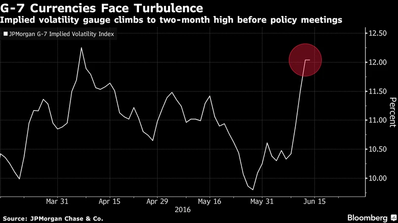 Na kampanię referendalną silnie reagują waluty. Tuż przed posiedzeniami banków centralnych w USA, Japonii i Wielkiej Brytanii zmienność w koszyku walut państw grupy G7 wzrosła do 2-miesięcznego maksimum.