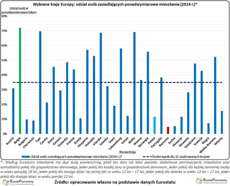 W Polsce oraz krajach naszego regionu (Czechy, Słowacja, Węgry), słabo zaludnione mieszkania są znacznie rzadszym zjawiskiem niż np. na terenie Belgii, Irlandii i Holandii. Więcej pokoi od liczby zalecanej przez UE, posiada aż 72% Belgów (2014 r.). Analogiczny wynik dla Polski, na razie wynosi około 12% i jest prawie trzykrotnie niższy od średniej z 32 analizowanych krajów. Jeszcze mniej słabo zaludnionych mieszkań znajdziemy na terenie Rumunii (5% populacji w takich lokalach), Serbii (5%), Węgier (7%), Chorwacji (9%), Bułgarii (10%) i Grecji (11%). W wielu przypadkach, można dostrzec prostą zależność pomiędzy poziomem zamożności danej nacji i odsetkiem mieszkań, które z naddatkiem zaspokajają potrzeby domowników.