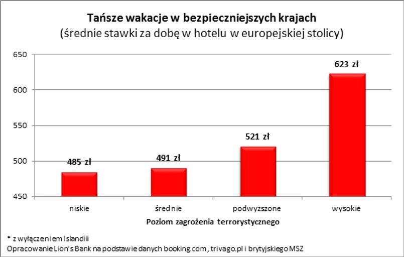 Biorąc pod uwagę zalecenia brytyjskiego MSZ można dojść do zaskakującego wniosku - wakacje w strefie najbardziej narażonej na ataki terrorystyczne byłyby najdroższe. Średnią stawkę za nocleg w stolicach krajów z tej grupy można oszacować na 623 zł za dobę (pokój 2-os.). W krajach bezpiecznych rachunek za hotel byłby wyraźnie niższy. Średnia stawka za pobyt dla modelowej rodziny w krajach o najniższym ryzyku atakami wynosi 543 zł. Przy czym, gdyby usunąć z tej grupy najdroższy w Europie Reykjavik, który mocno zawyża wynik, to osiągnęlibyśmy już przeciętną kwotę na poziomie 485 zł za dobę. To niemal o jedną czwartą taniej niż w europejskich krajach, na terenie których terroryści skupiają swoje ataki.
