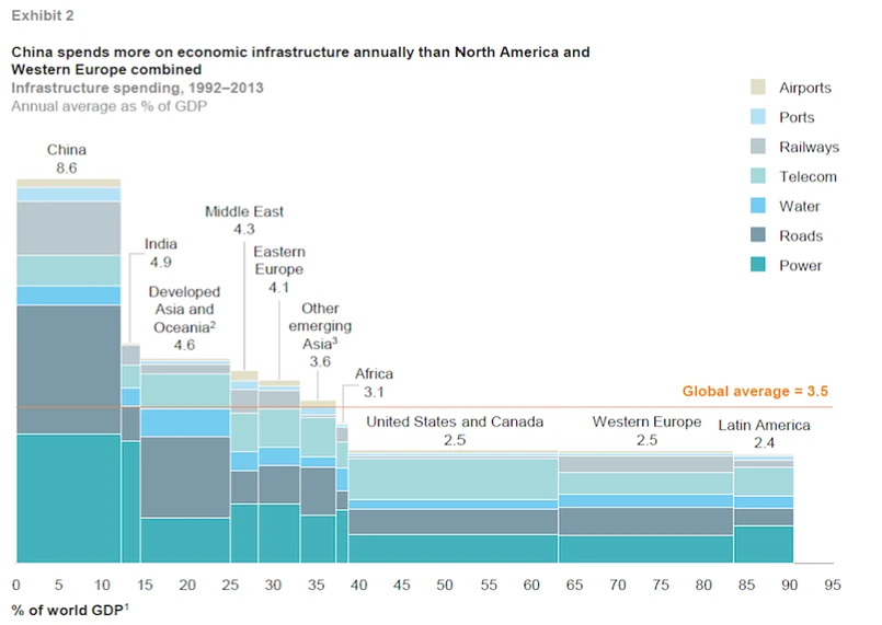 Na wykresie obok widać, jak mocno Państwo Środka wyróżnia się na tle innych krajów w kontekście inwestycji. Słupek Chin jest najwyższy. Kolorowe fragmenty na wykresie opisują poszczególne rodzaje infrastruktury, a szerokość słupków odzwierciedla wielkość danej gospodarki. Słupek przypisany Stanom Zjednoczonym jest szeroki, ale krótki – reprezentuje bowiem wielką gospodarkę z niskim poziomem wydatków inwestycyjnych.