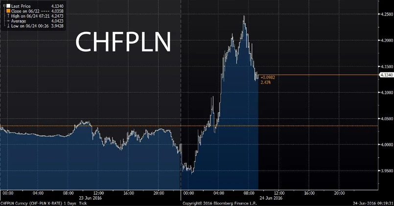 Równie mocno ucierpiał polski złoty, który typowany był jako jedna z walut, która w najmocniejszym stopniu może ucierpieć na tzw. „Brexit’cie”. Najmocniejsze ruchy obserwujemy wobec USD oraz CHF czyli walut traktowanych jako bezpieczne przystanie w trakcie „rynkowych dramatów”.