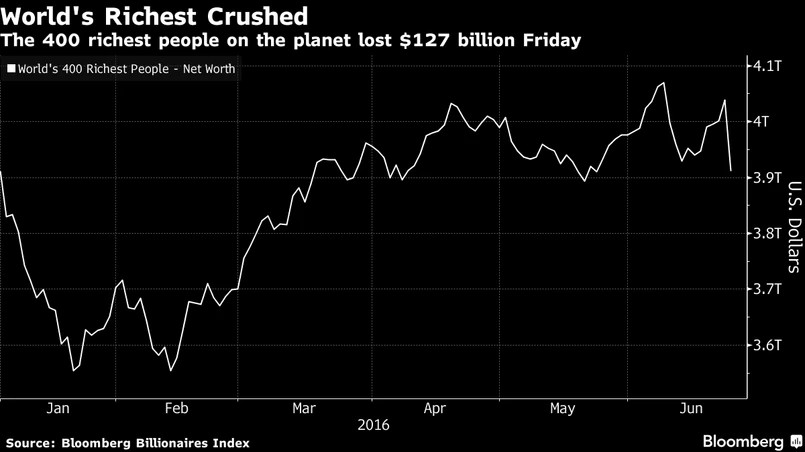Brexit odcisnął się piętnem nie tylko na fortunach zamożnych Brytyjczyków, ale uszczuplił też majątki najbogatszych ludzi świata. Z powodu załamania na rynkach, 400 miliarderów z listy Bloomberga straciło w piątek w sumie 127,4 mld dol. To 3,2 proc. ich całkowitego majątku netto.