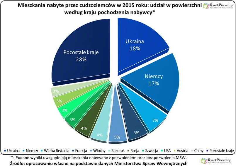 Najnowsze dane Ministerstwa Spraw Wewnętrznych wskazują, że w 2015 r. doszło do bezprecedensowej zmiany. Obywatele Ukrainy po raz pierwszy mieli największy udział w powierzchni nabywanych mieszkań (patrz poniższy wykres). Dotychczas to Niemcy byli najważniejszą grupą wśród zagranicznych inwestorów mieszkaniowych. Według danych MSW, sąsiedzi zza zachodniej granicy w 2015 r. kupili 17% wszystkich mieszkań nabywanych przez cudzoziemców. Analogiczny wynik dla obywateli Ukrainy wyniósł 18% (patrz poniższy wykres). Stosunkowo duży udział w powierzchni zakupionych lokali mieli również: