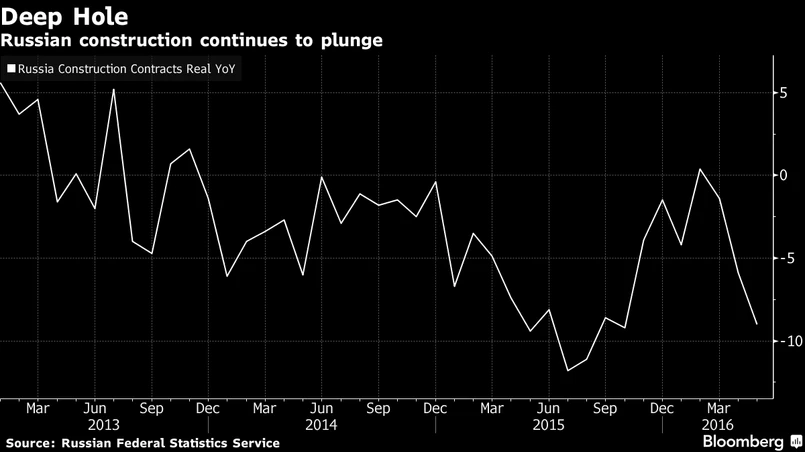 Biorąc pod uwagę obecną kondycję branży budowlanej i jej perspektywy, inwestycyjny zryw oczekiwany przez Putina będzie trudny do zrealizowania. Nakłady inwestycyjne spadają już najdłużej od co najmniej 1995 roku, od kiedy Blooomberg monitoruje dane. Ministerstwo gospodarki Rosji przewiduje, że w tym roku wydatki na inwestycje skurczą się o kolejne 3,1 proc.