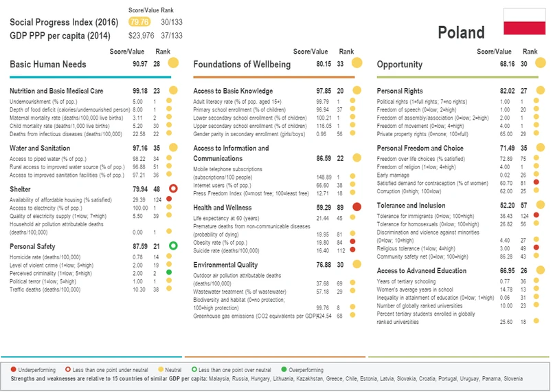 "W tym roku w zestawieniu uwzględniono 133 państwa, które obejmują swym zasięgiem 94% światowej populacji. Podobnie jak w przeszłości, w tegorocznej edycji Social Progress Index najwyżej oceniono kraje Europy, Ameryki Północnej oraz Australii, a najgorzej państwa Afryki subsaharyjskiej oraz Azji Środkowej i Południowej" - czytamy w komunikacie.