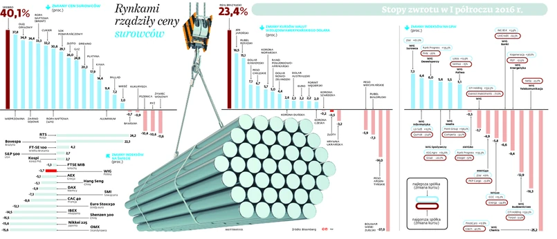 Po trwającej półtora roku gwałtownej fali spadkowej pierwsza połowa 2016 r. upłynęła pod znakiem wzrostu cen surowców. Ropa naftowa podrożała o jedną trzecią – w czerwcu cena baryłki gatunku brent po raz pierwszy od października zeszłego roku przekroczyła granicę 50 dolarów. W dalszym ciągu jednak jest to poziom o ponad połowę niższy niż jeszcze w pierwszej połowie 2014 r. Niska cena ropy spowodowała, że dla części producentów wydobycie surowca stało się nieopłacalne, co zmniejszyło podaż i doprowadziło do wzrostu notowań. Ponad 20 proc. zyskało w pierwszych sześciu miesiącach 2016 r. złoto, które – podobnie jak obligacje państw wysoko rozwiniętych – uważane jest za bezpieczną przystań na czas niepewności w globalnej gospodarce. W czerwcu, po raz pierwszy od dwóch lat, cena uncji złota przekroczyła granicę 1300 dol. Rynkowi surowców sprzyja także kolejna fala inwestycji w Chinach, które w ten sposób starają się podtrzymać słabnący wzrost gospodarczy.