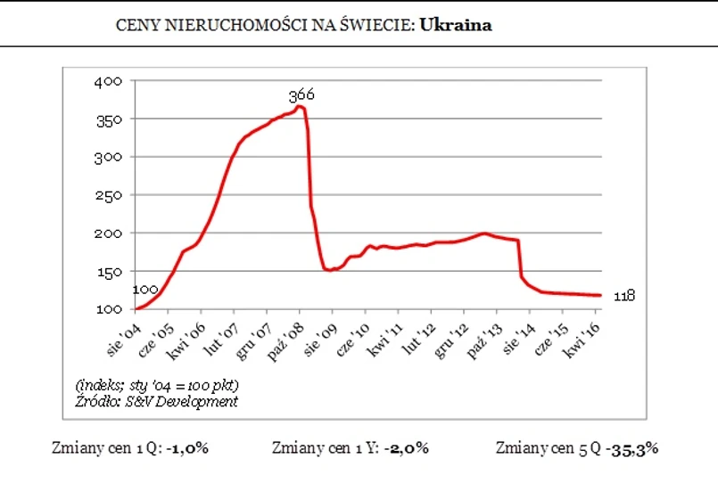 Gdyby tego było mało, jeszcze w 2008 roku za kijowski metr trzeba było płacić nawet ponad 3,6 tys. dolarów. To oznacza, że w wyniku gwałtownej przeceny trwającej prawie 8 lat ceny nieruchomości na Ukrainie spadły łącznie o 67,8%.